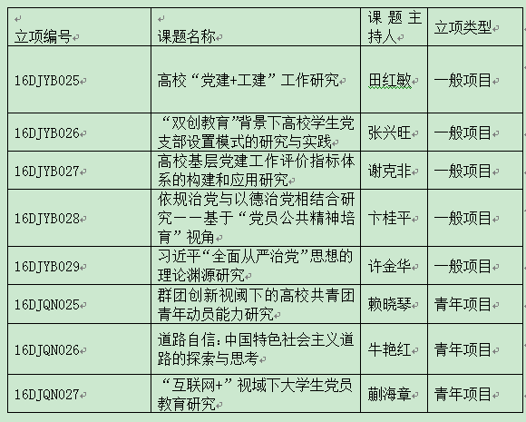 根据中共江西省委教育工委、江西省教育厅《关于2016年度江西省高校党建研究项目立项的通知》(赣教党字〔2016〕118号),我校共有8项2016年江西省高校党建研究项目获准立项。具体名单如下:
